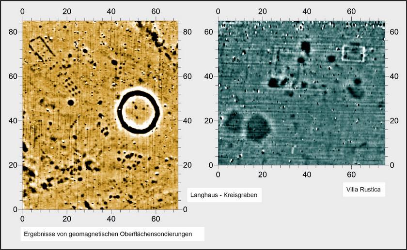 Für diesen Fall bieten wir Ihnen abhängig von den zu erwarteten Befunden eine flächige geophysikalische Kartierung an. Dabei kommt in erster Linie das geomagnetische Verfahren zum Einsatz mit dem auch weitläufige Flächen zuverlässig untersucht werden (siehe auch: Vortrag über Geomagnetische Prospektion). Das geoelektrische Verfahren und Untersuchungen mit dem Bodenradar werden zur Erfassung von Fundamentresten eingesetzt.